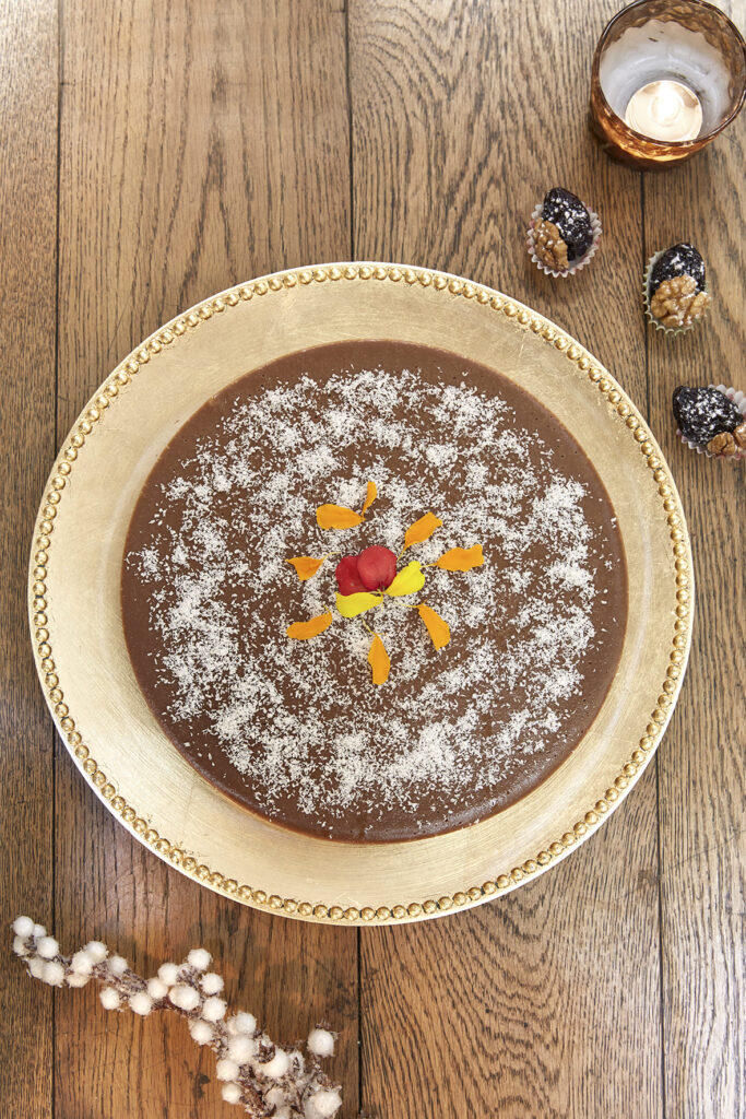 Heat all the ingredients together for 14 minutes until well-integrated and then puree. Add the zest at the end, pour into the mould and leave to cool in the fridge for 2 hours. Decorate with grated coconut and plums filled with walnuts.